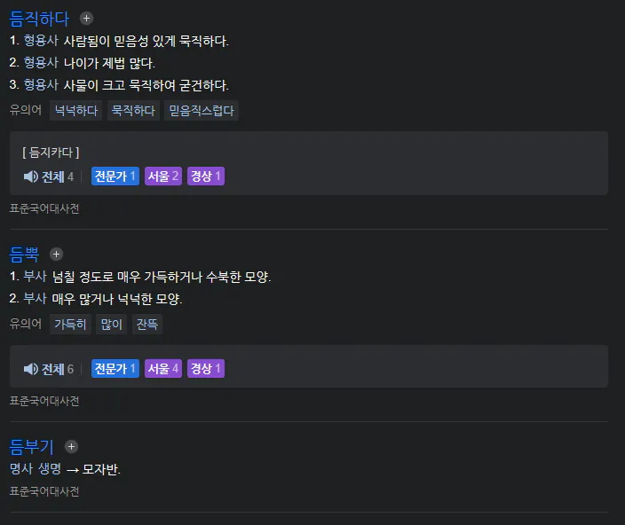 • 듬쑥하다: 방언으로 ‘과묵하다(寡默–)’의 방언(전남)이다.