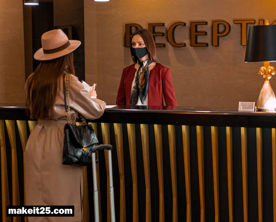 호텔 리셉션: 호텔에 방문한 고객들을 맞이하고 안내하는 역할을 합니다. 체크인, 체크아웃, 객실 안내, 예약 안내 등을 담당합니다.