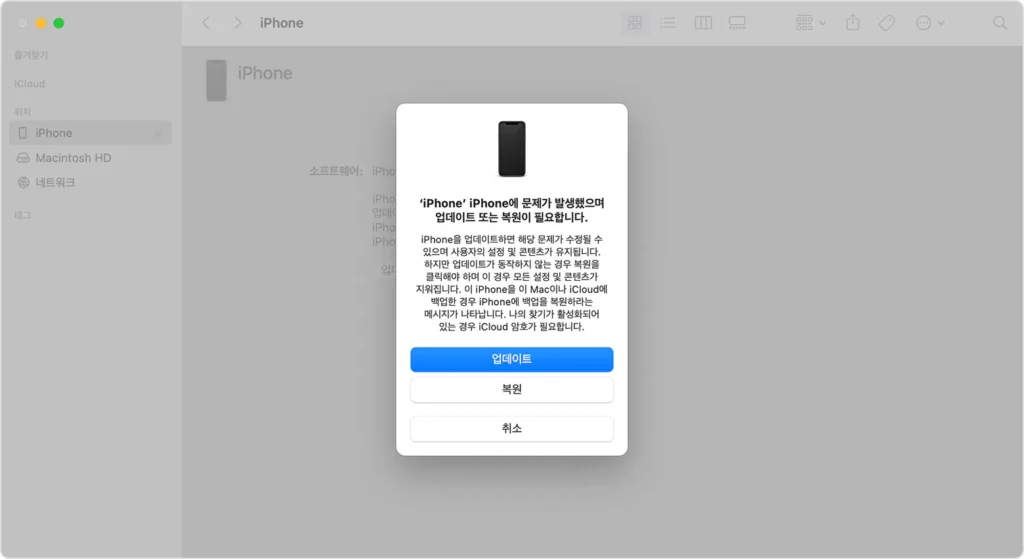 - 복원 또는 업데이트 옵션이 나타나면 ‘복원’을 선택합니다. 컴퓨터에서 iPhone용 소프트웨어가 다운로드되고 복원 절차가 시작됩니다. 다운로드하는 데 15분 이상 걸리고 기기에서 복구 모드 화면이 종료되는 경우 다운로드가 완료된 후 iPhone을 끄고 재시동합니다.