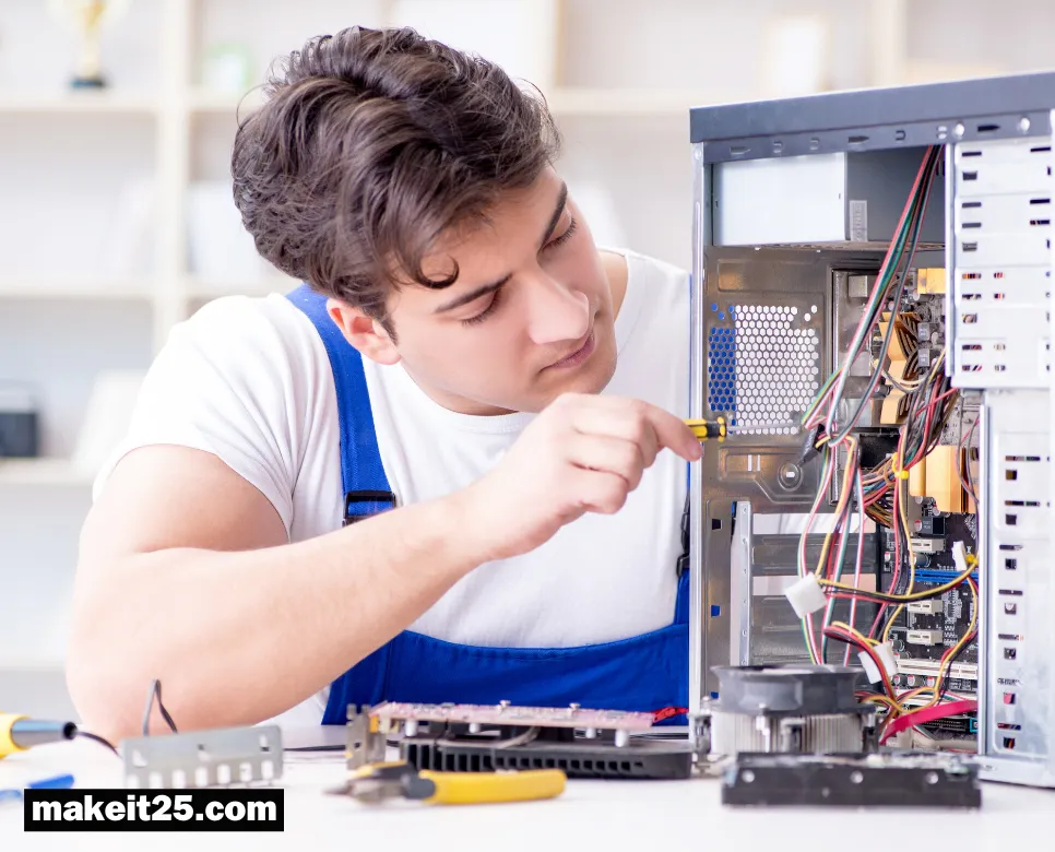컴퓨터의 케이스, 메인보드, CPU, 메모리, 그래픽 카드, 하드 드라이브, 모니터, 키보드, 마우스 등
