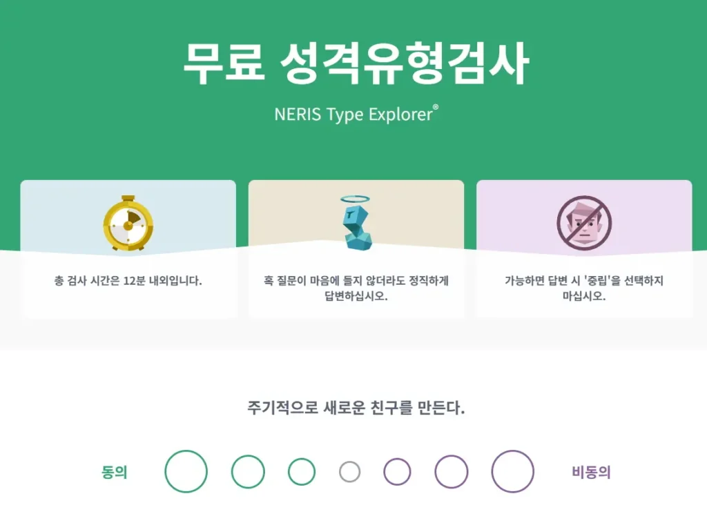 총 검사 시간은 12분 내외입니다. 혹 질문이 마음에 들지 않더라도 정직하게 답변하십시오. 가능하면 답변 시 ‘중립’을 선택하지 마십시오. 주기적으로 새로운 친구를 만든다. 자유 시간 중 상당 부분을 다양한 관심사를 탐구하는 데 할애한다. 다른 사람이 울고 있는 모습을 보면 자신도 울고 싶어질 때가 많다. 등의 질문들로 성격 유형을 파악합니다.